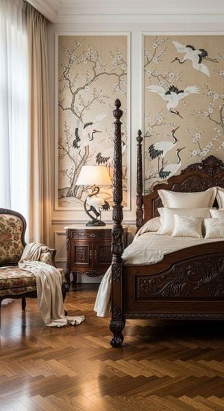 Tranh Tùng Hạc Diên Niên: Biểu tượng của sự trường thọ, quyền quý và gắn bó (rất hợp với phong cách Indochine).