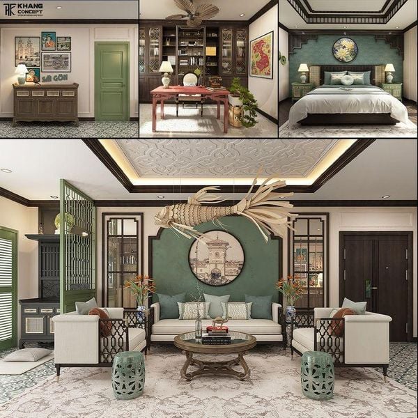 Việc chọn tranh cần phù hợp với chức năng và tinh thần của từng phòng để tạo nên sự hài hòa tổng thể theo phong cách Đông Dương.