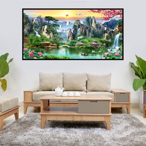 Bức tranh khổ rất lớn này phù hợp treo tại phòng khách rộng, nhìn phong cảnh thật tươi mát, thư thái, an nhiên.