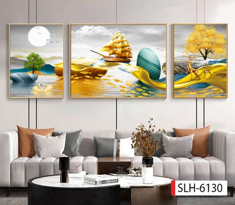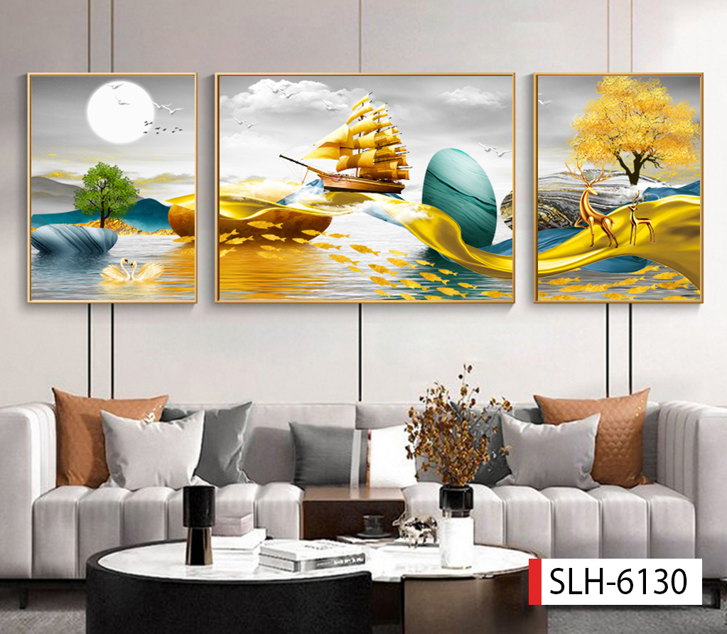 TRANH TREO PHÒNG KHÁCH SOFA - TRANH TRANG TRÍ - TRANH TREO TƯỜNG HƯƠU TÀI LỘC - KIỂU TRANH GHÉP BỘ 3 BỨC
