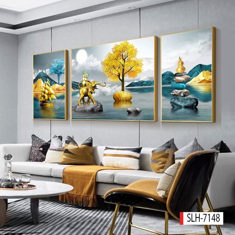 TRANH TREO PHÒNG KHÁCH SOFA - TRANH TRANG TRÍ - TRANH TREO TƯỜNG HƯƠU TÀI LỘC - KIỂU TRANH GHÉP BỘ 3 BỨC