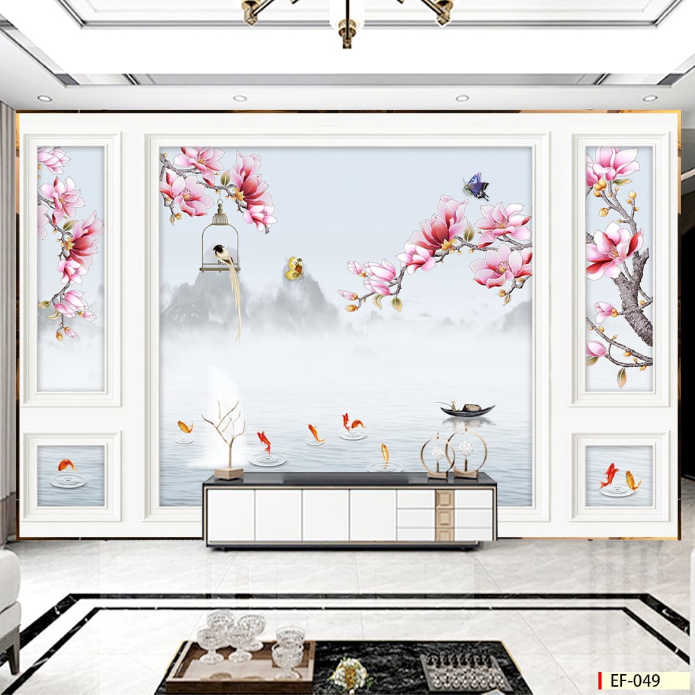 - Tranh vải 3D dán tường - vải lụa kim sa phủ bóng ít bám bụi, dễ lau chùi vệ sinh, thi công nhanh gọn.