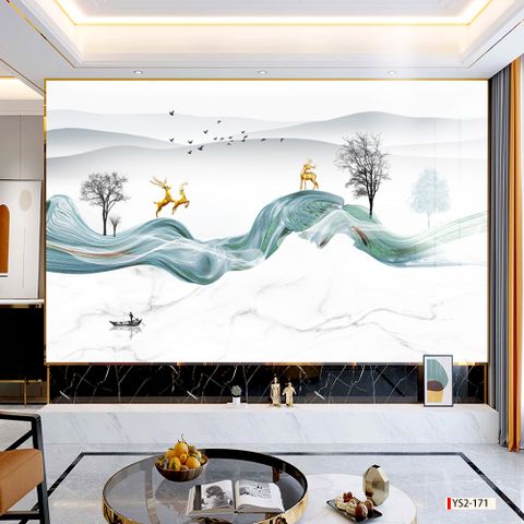 | Thương hiệu: Tranh 3D Tùng Dương | Hình thức: tranh ốp tường | Hoa văn: Dải lụa, cây kim tiền, huơu tài lộc, sông núi, nước |