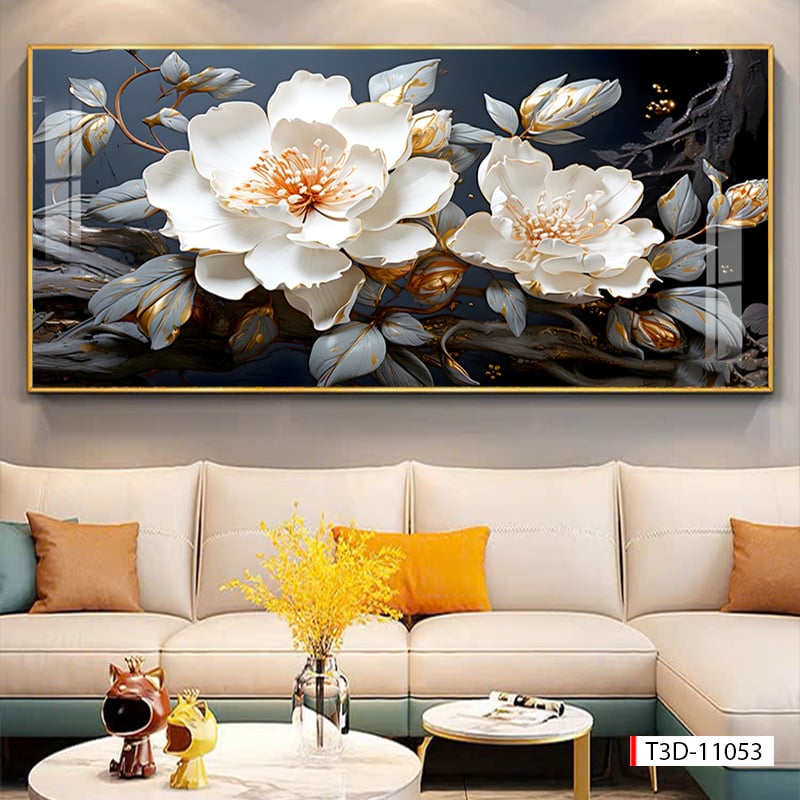 - Tranh Hoa 3D được làm từ chất liệu PVC bột đá, in UV phủ sứ pha lê Sang trọng. Độ bền cao trên 20 năm.