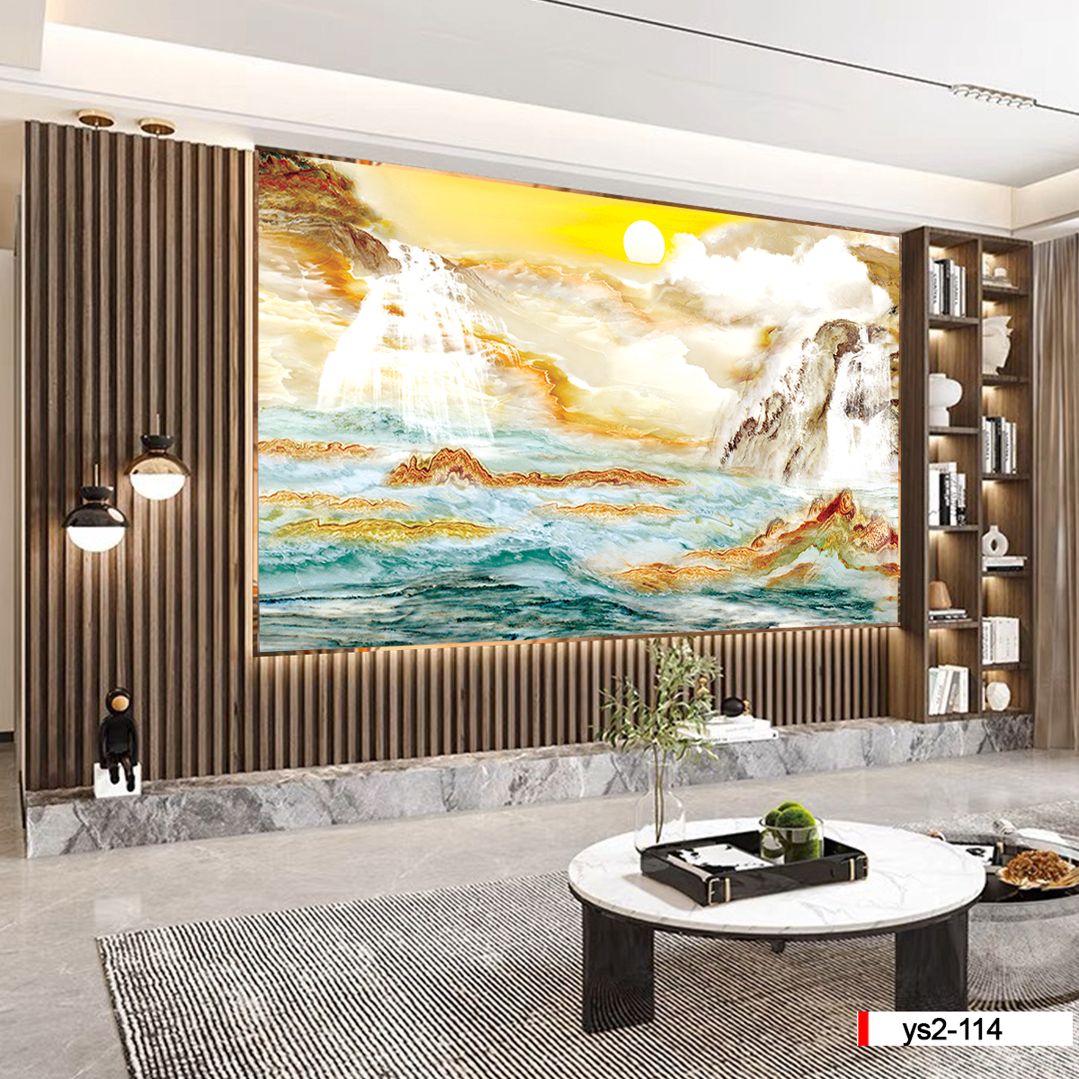 Tranh PVC ốp tường trở nên phổ biến trong việc trang trí phòng khách, được nhiều người ưa chuộng bởi những ưu điểm vượt trội của nó mang lại. Sử dụng tranh PVC vân đá phong cảnh giúp cho không gian trở nên sang trọng hài hòa hơn. Không những thế, tranh vân đá phong cảnh còn thể hiện được sở thích cá tính riêng biệt của gia chủ, những người có tâm hồn rộng mở, yêu thiên nhiên bao la hùng vỹ.