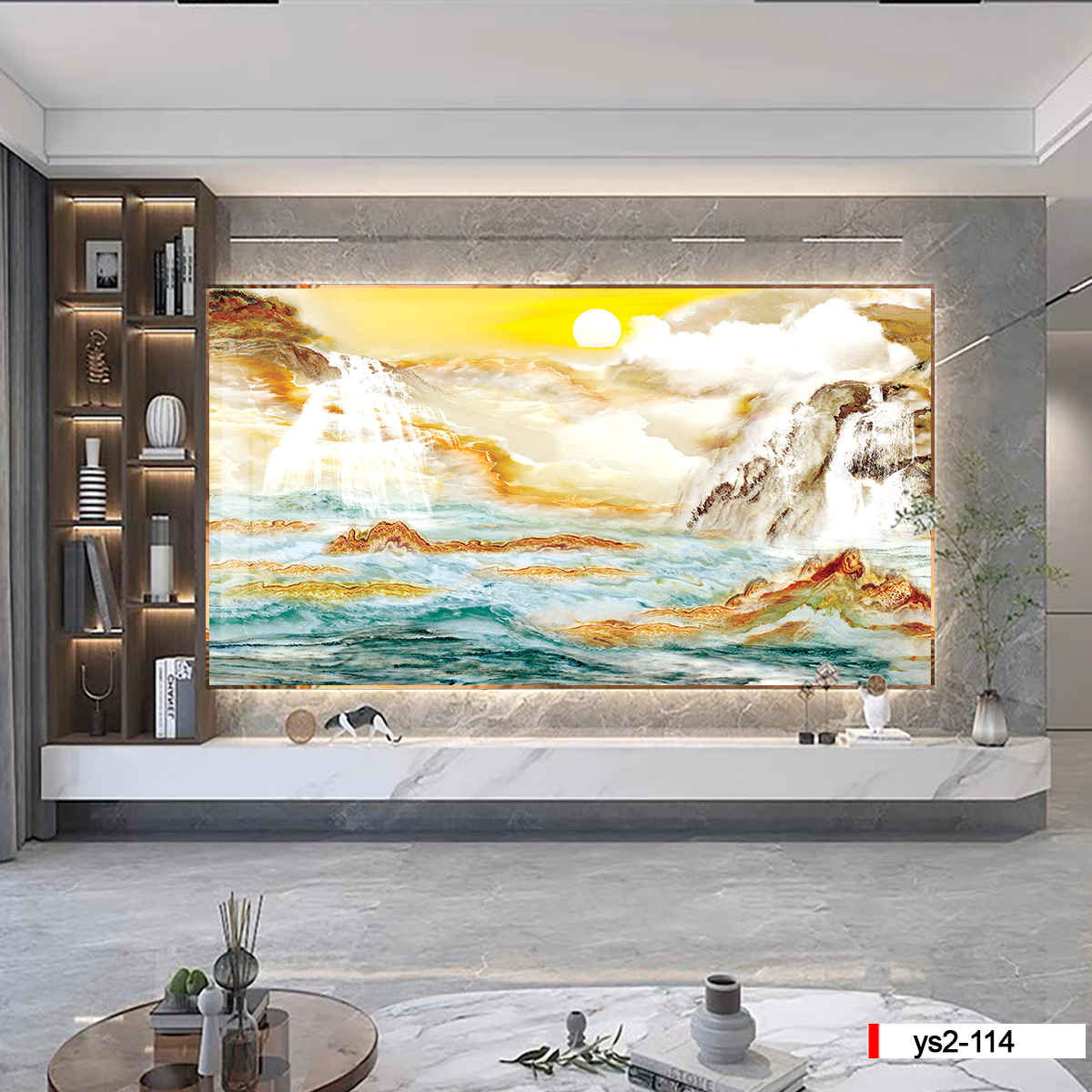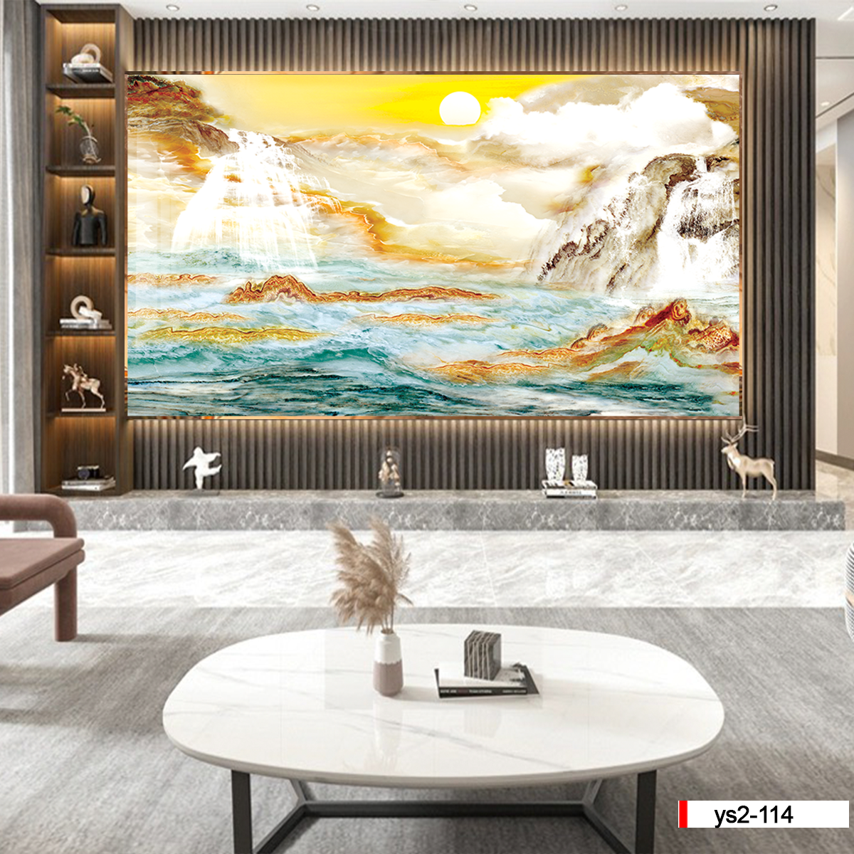 Tranh vân đá phong cảnh thích hợp cho trang trí phòng khách, kệ ti vi, nơi được coi là không gian nội thất chính của ngôi nhà. Tạo nên một không gian trang trọng nhã nhặn vừa hiện đại lại vừa cổ điển mà ít một loại đồ trang trí nào có thể làm được.