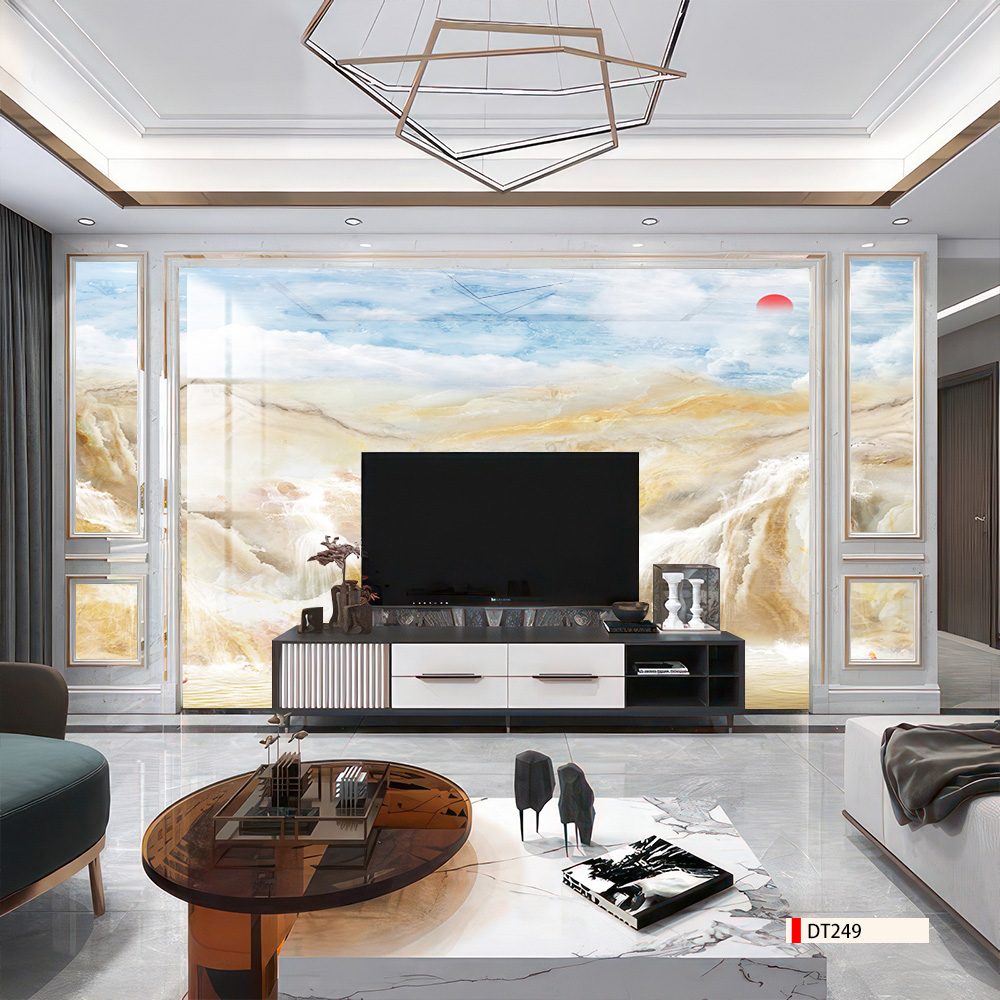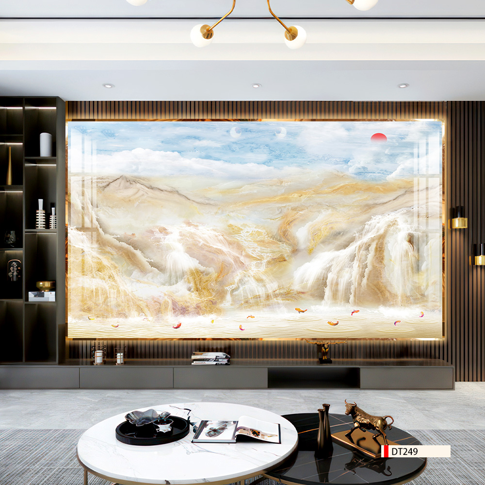 Tranh vân đá phong cảnh thích hợp cho trang trí phòng khách, kệ ti vi, nơi được coi là không gian nội thất chính của ngôi nhà. Tạo nên một không gian trang trọng nhã nhặn vừa hiện đại lại vừa cổ điển mà ít một loại đồ trang trí nào có thể làm được.