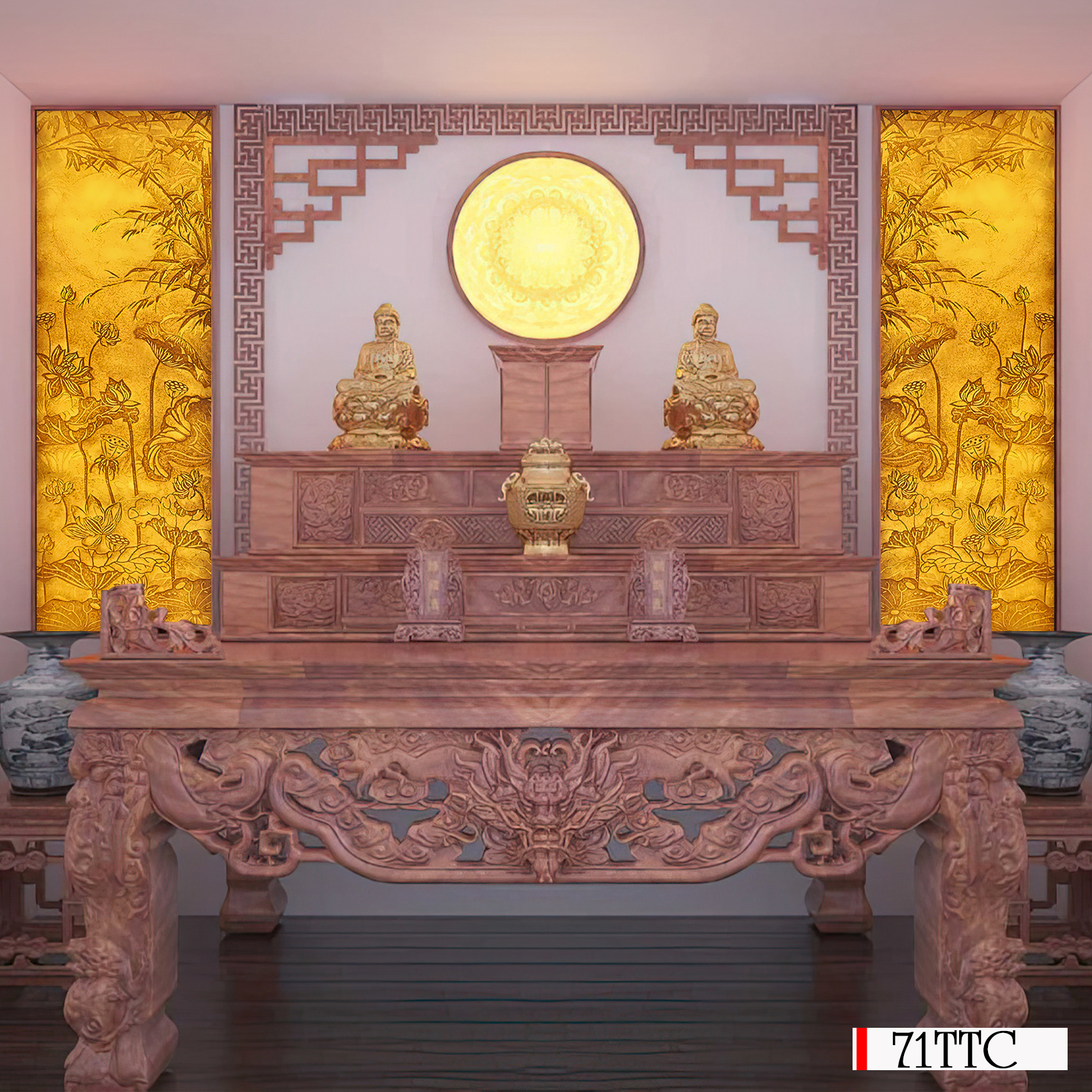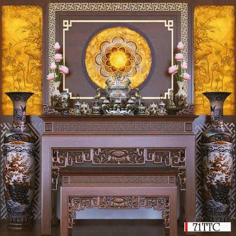 - Sử dụng tông màu vàng ấm áp tạo nên không gian phòng thờ trang trọng, yên bình và thanh tĩnh.