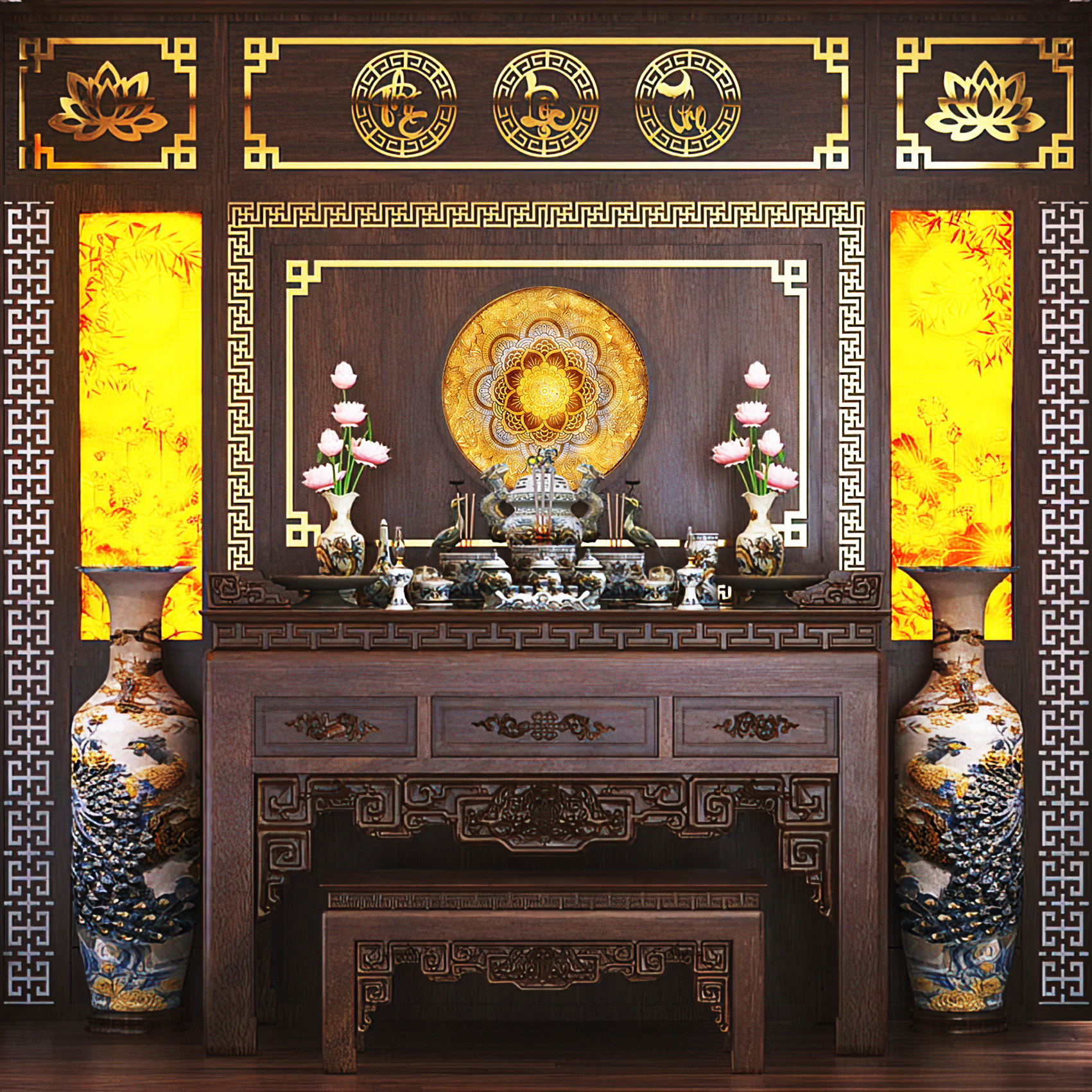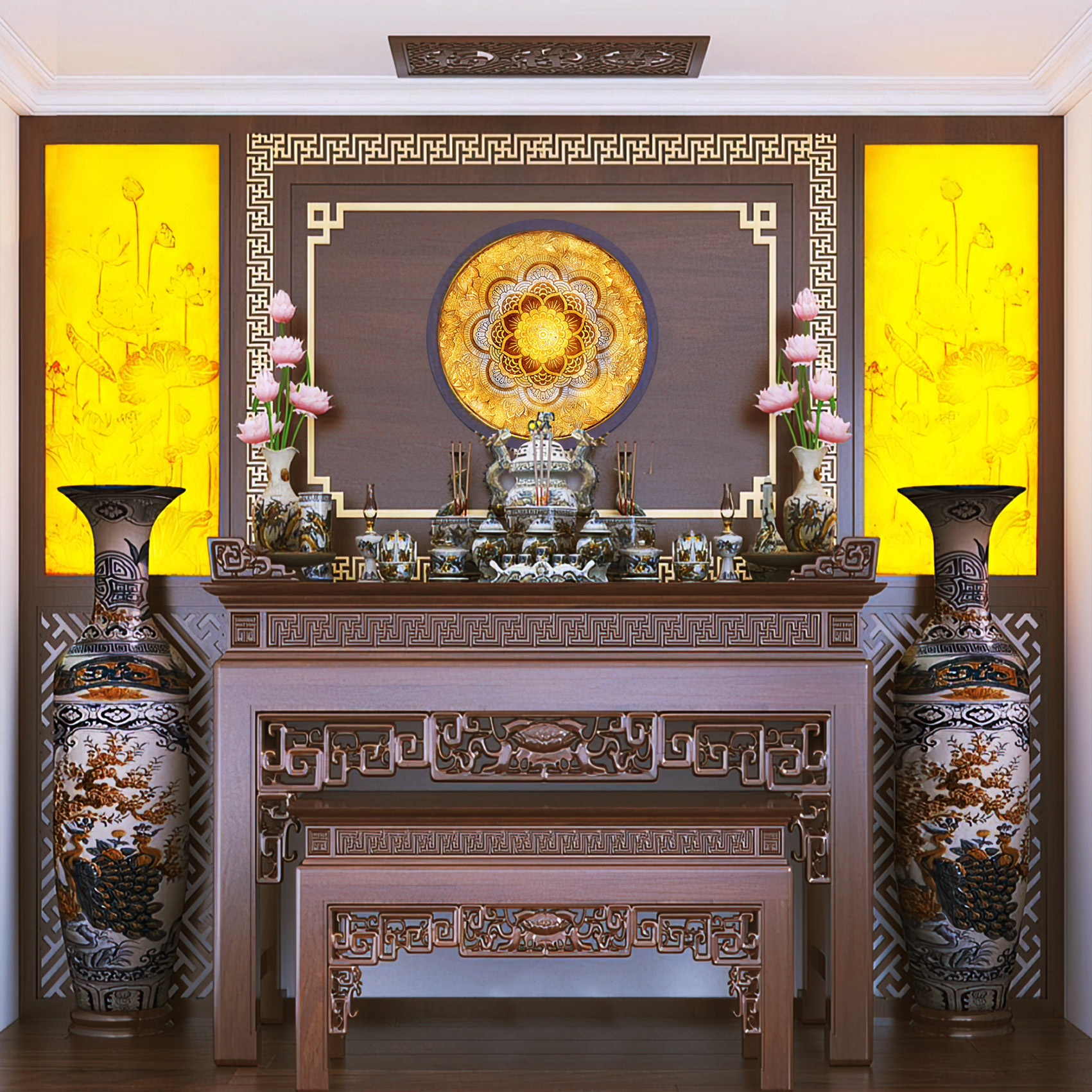 - Sử dụng tông màu vàng ấm áp tạo nên không gian phòng thờ trang trọng, yên bình và thanh tĩnh.