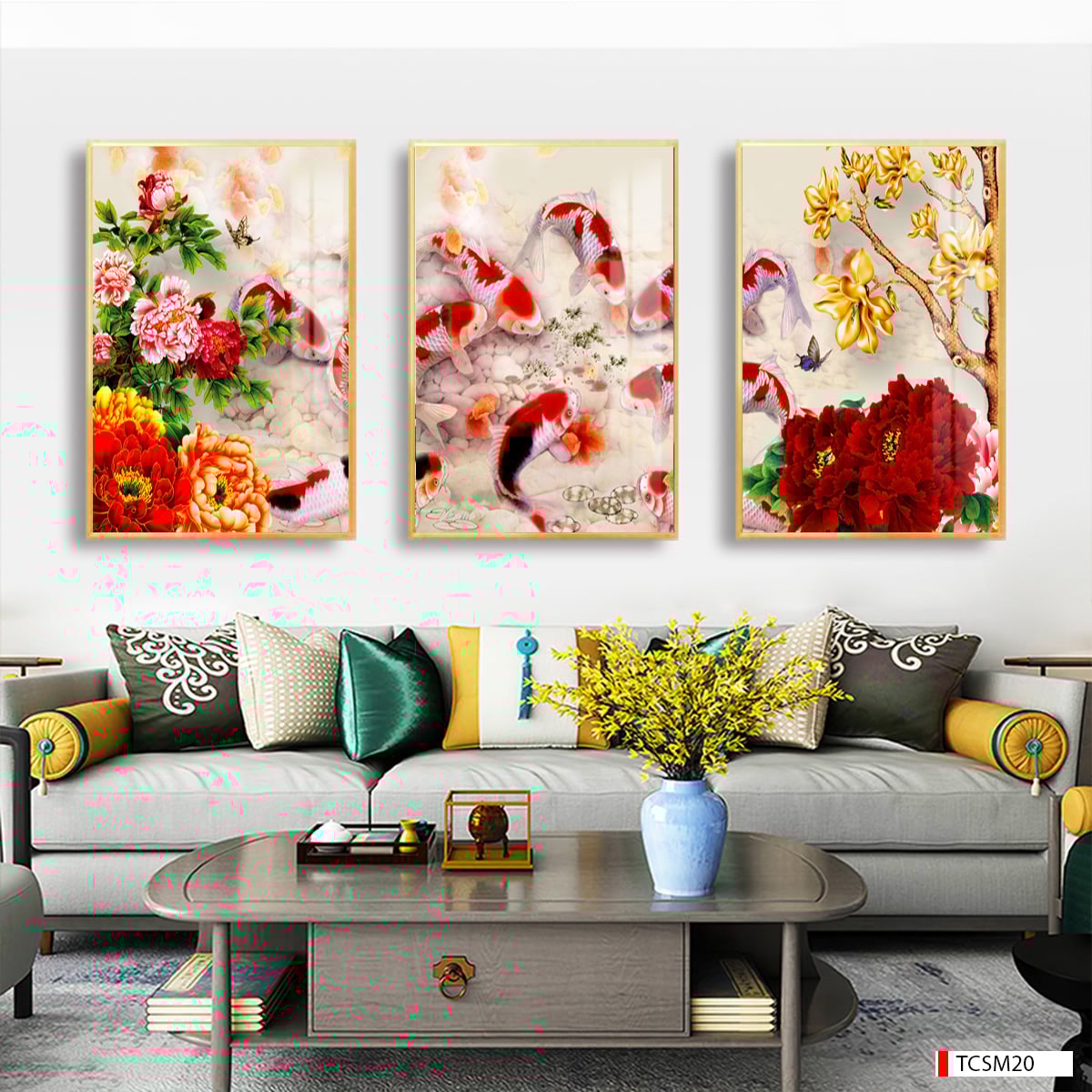 | Thương hiệu: Tranh 3D Tùng Dương | Hình thức: tranh treo tường ghép bộ 3 bức | Tên: tranh Hoa sen Cá chép |