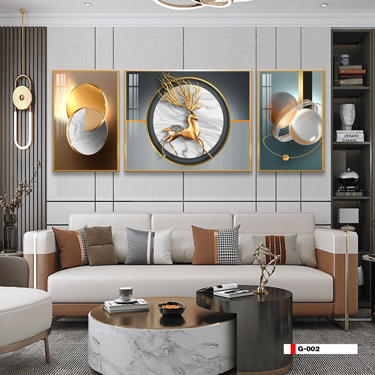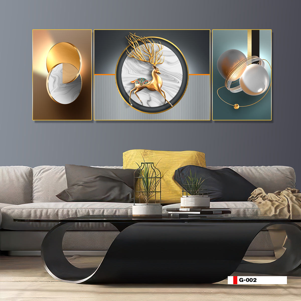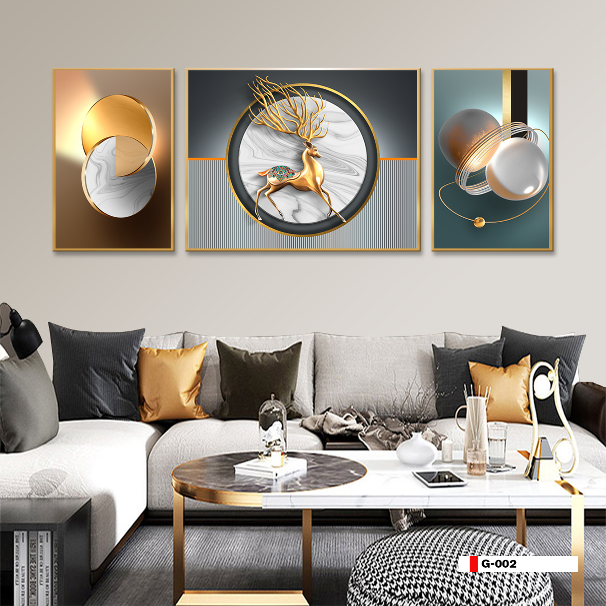 | Thương hiệu: Tranh 3D Tùng Dương | Hình thức: tranh treo tường ghép bộ 3 bức | Tên: tranh Kim tiền Hươu tài lộc |