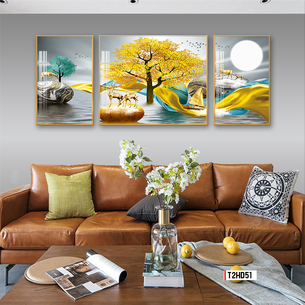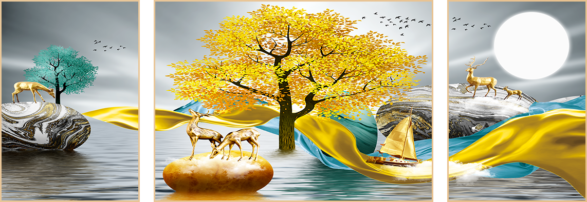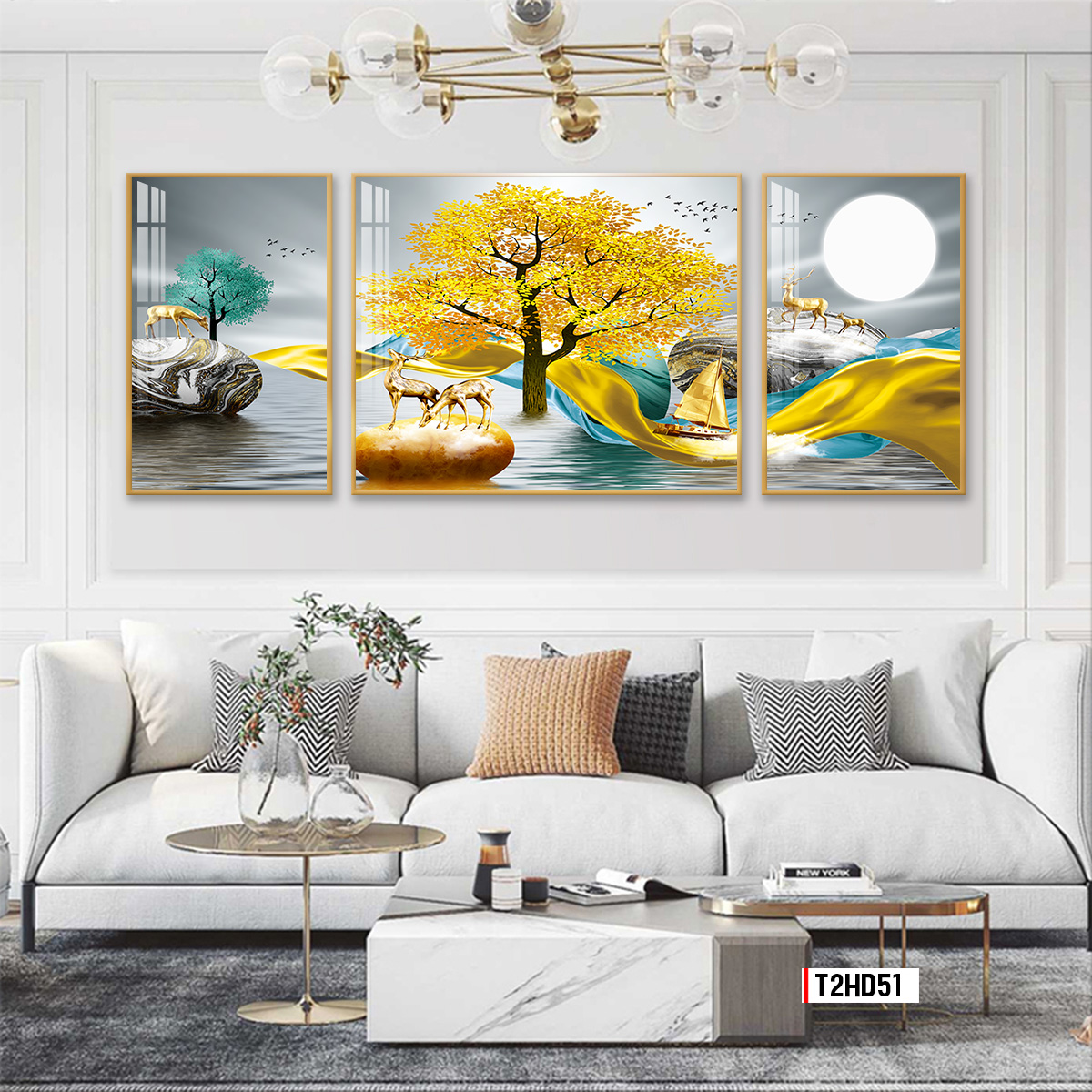 | Thương hiệu: Tranh 3D Tùng Dương | Hình thức: tranh treo tường ghép bộ 3 bức | Tên: tranh Hươu tài lộc |